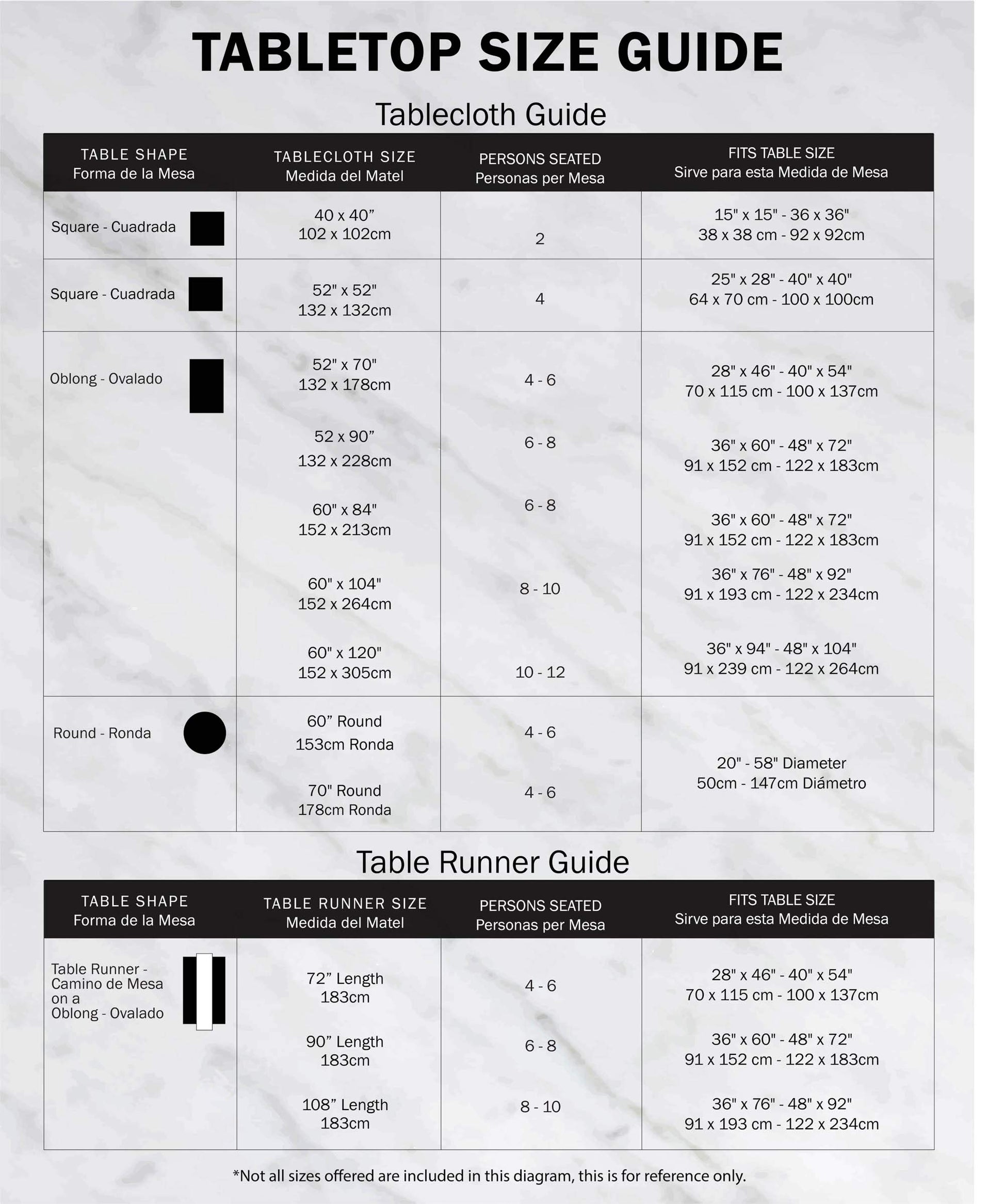 - Tablecloth seats 2-4 people - see tablecloth size chart in images to decide on size needed for your table