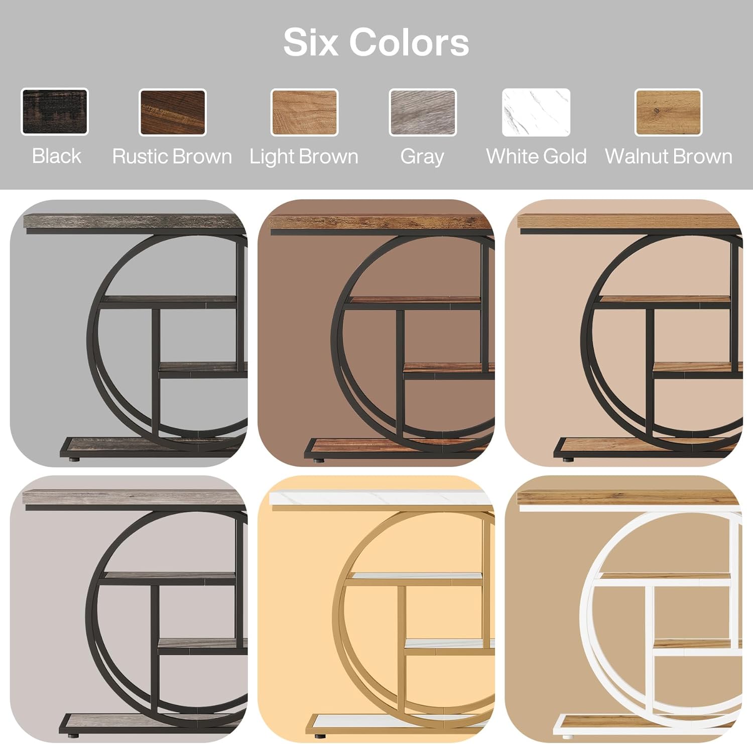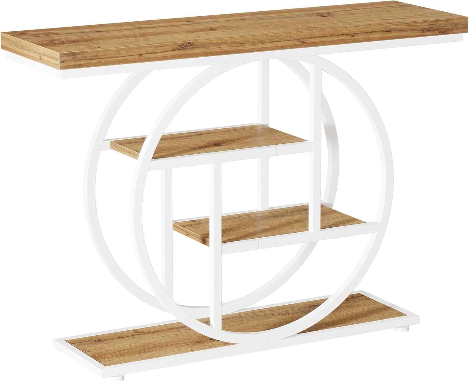 - INDUSTRIAL CHIC - The 41.3" console table with a circle base exudes industrial charm with its rugged and sturdy design. The rustic brown finish on the surfaces of shelves adds a touch of warmth and vintage appeal, and the middle two shelves are ingeniously placed within a large circular metal frame, making it a truly unique and eye-catching centerpiece in the hallway.